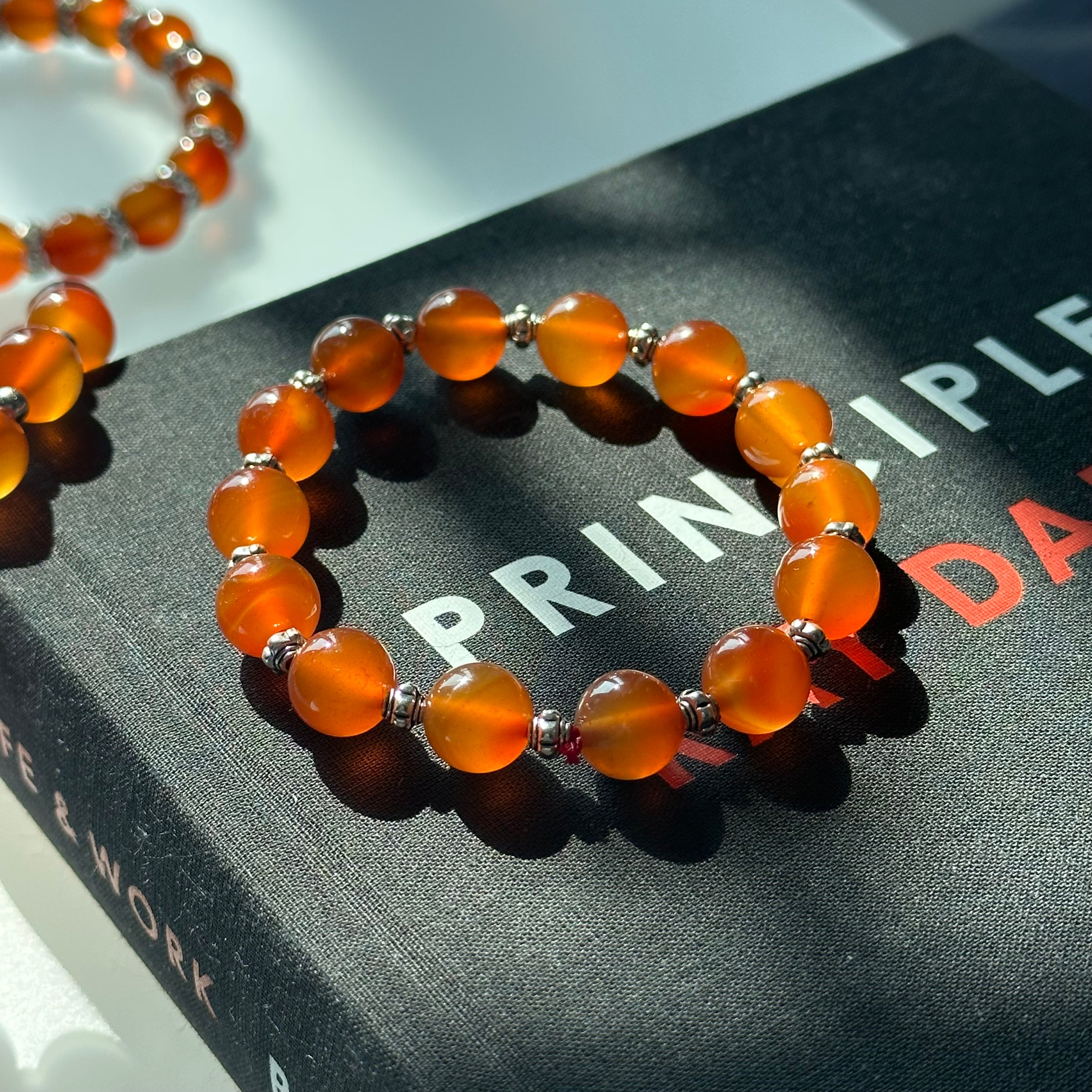溫潤的紅瑪瑙宛如梧桐樹下累積的秋色,橙紅光影在指間綻放,映照出家的溫暖與安靜守候。銀飾點綴間,歲月流轉,如同梧桐庭院裡的午後靜謐,四時更迭,人情歷歷不改。佩戴此串,彷彿在一方歲月靜好的居所,收納回憶、守護心願,讓勇氣與溫柔如梧桐葉影般相隨。